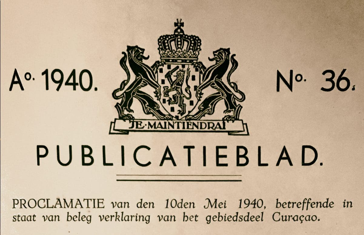 In front, an enamel plate sported the code of arms of the Dutch kingdom, including the year 1934 right above it. In the back of the column a motto was displayed: “The colonial government of Curaçao presented by the Curaçaoan Petroleum Industry Company and the Curaçaoan Shipping Company.” The expansion showed scenes of the occupation of Curaçao by the Dutch in 1634, led by commander Van Walbeeck. In the back of the expansion a colorful enamel Code of Arms of the Dutch West India Company was mounted, topped by the year 1634.