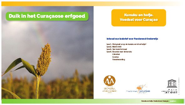 Duik in het Curaçaose erfgoed Edukatief Materiaal lessenserie over immaterieel cultureel erfgoed van Curaçao Klèk pa e vershon na papiamentu Funderend Onderwijs (2e cyclus) Algemene handleiding Het scheepswrak ‘Alphen’ en de onderwaterarcheologie van Curaçao Handleiding Forten. De strijd om Curaçao Handleiding Indianen onder het zand. Ontdek de Curaçaose archeologie Handleiding Kunuku en hofje. Voedsel voor Curaçao Handleiding Genezen met de tradities van je voorouders Handleiding Muzik di Zumbi. Muziek van Curaçao Handleiding Voortgezet onderwijs Algemene handleiding Het scheepswrak ‘Alphen’ en de onderwaterarcheologie van Curaçao Handleiding Forten. De strijd om Curaçao Handleiding Indianen onder het zand. Ontdek de Curaçaose archeologie Handleiding Kunuku en hofje. Voedsel voor Curaçao Handleiding Genezen met de tradities van je voorouders Handleiding Muzik di Zumbi. Muziek van Curaçao Handleiding